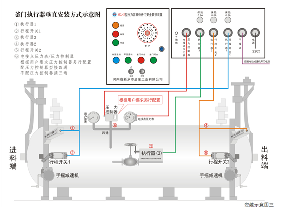 1.將主控箱安裝在便于觀察操作、防水防雨的地方,接通AC220V電源。將三通(壓力控制需配四通)安裝在進料端釜門上部原壓力表處。