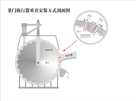 2.3.2.將壓力容器的快開門裝置關好,使其處于鎖緊閉合到位,確認鎖緊及開啟方向,按《安全聯鎖裝置安裝圖》規定,在外齒圈鎖緊時的前進方向,距殼體內齒圈前端20±1mm在齒圈上畫安全銷孔橫中心線,兩點交叉處為銷孔圓心。